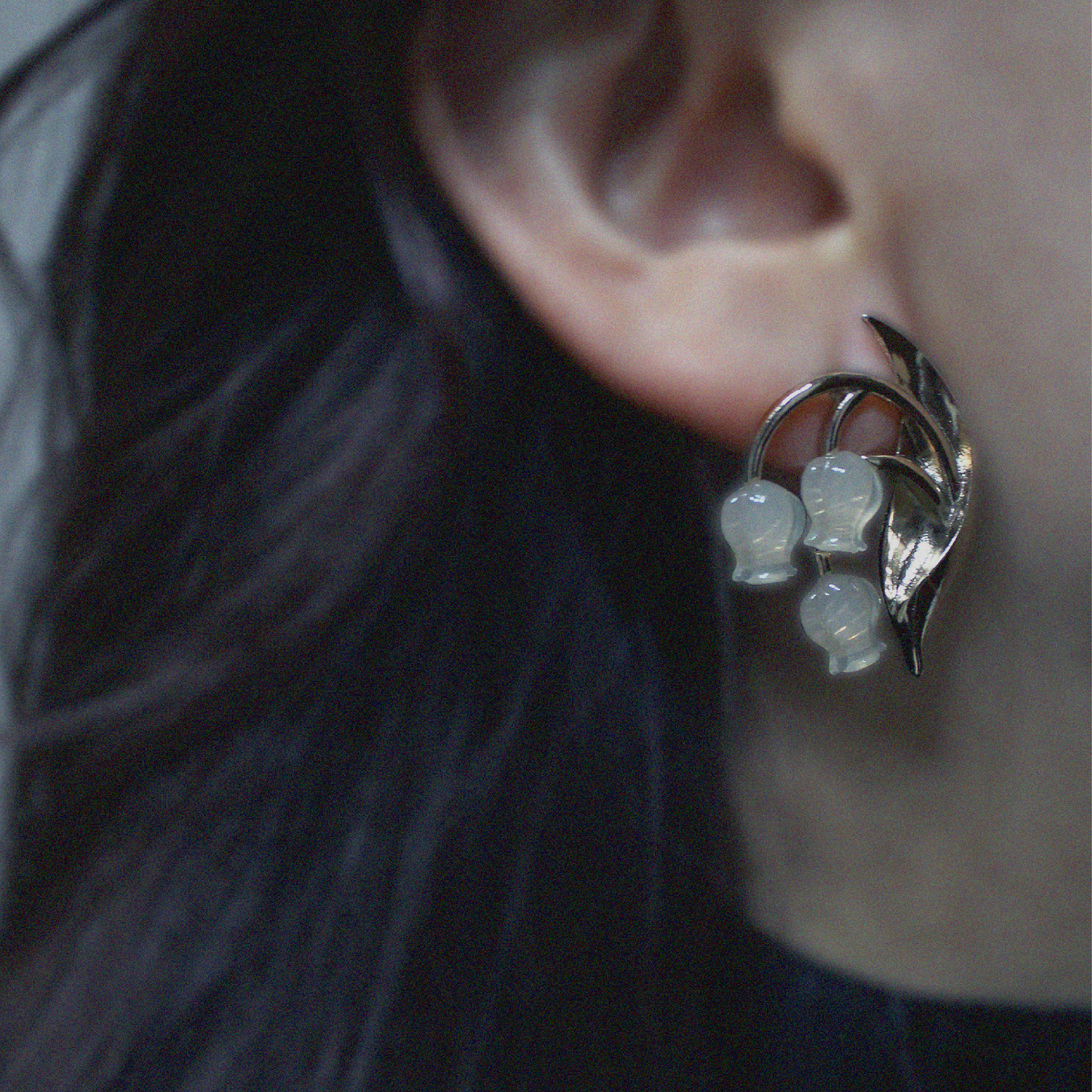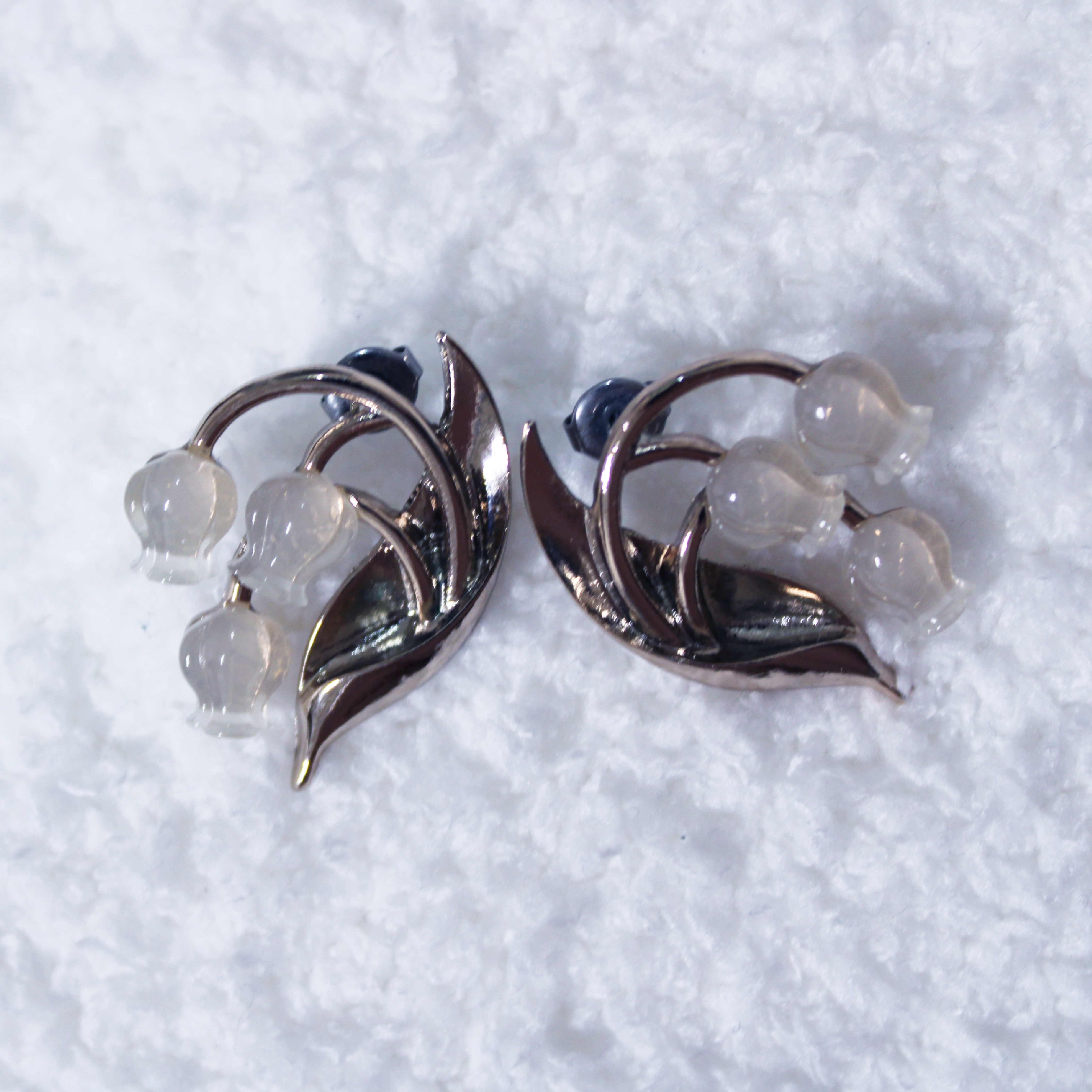 可憐なスズランを乳白カラーの樹脂で仕上げた優しい印象のアクセサリー。 やや大ぶりで、お顔まわりの存在感は抜群。メッキカラーはうす金です。