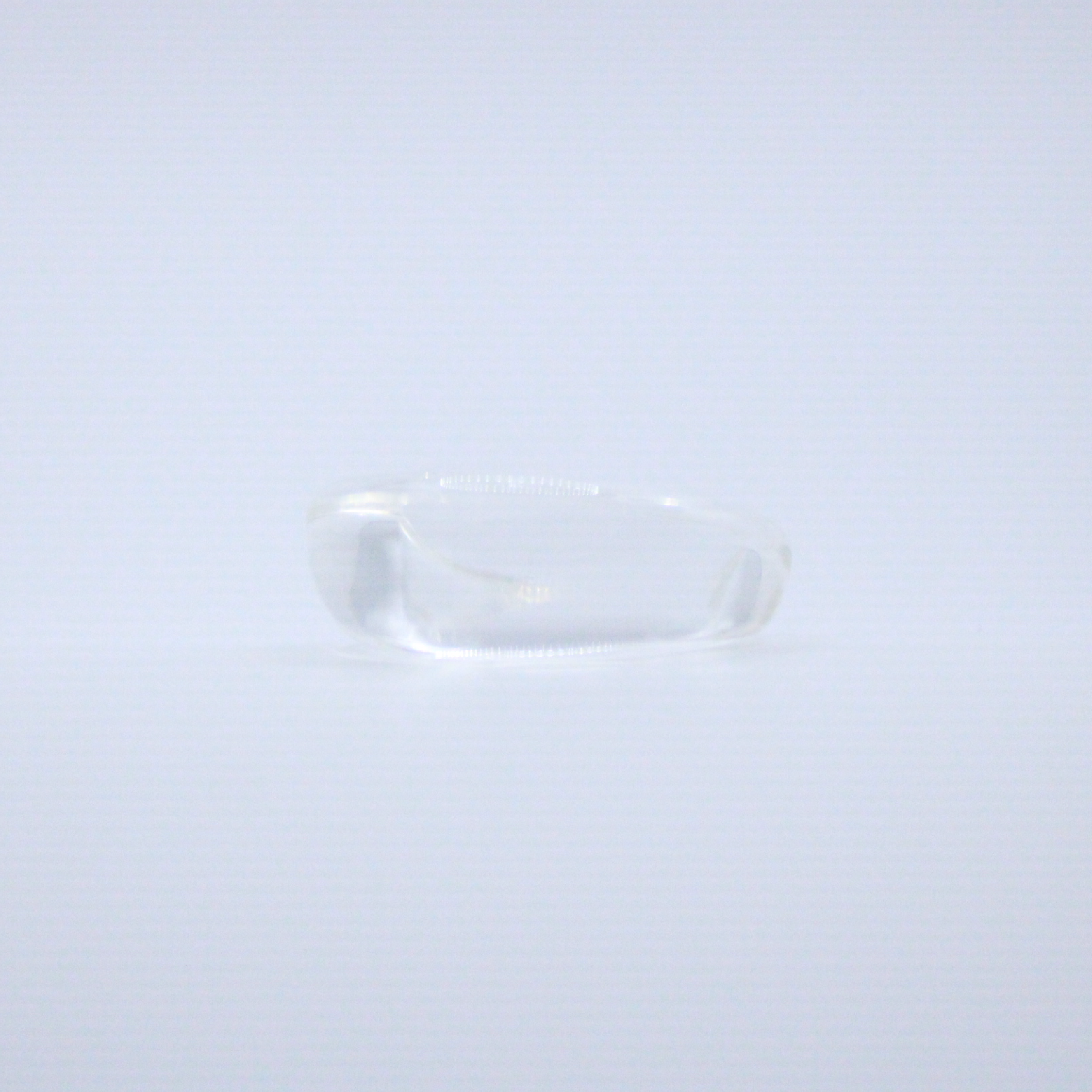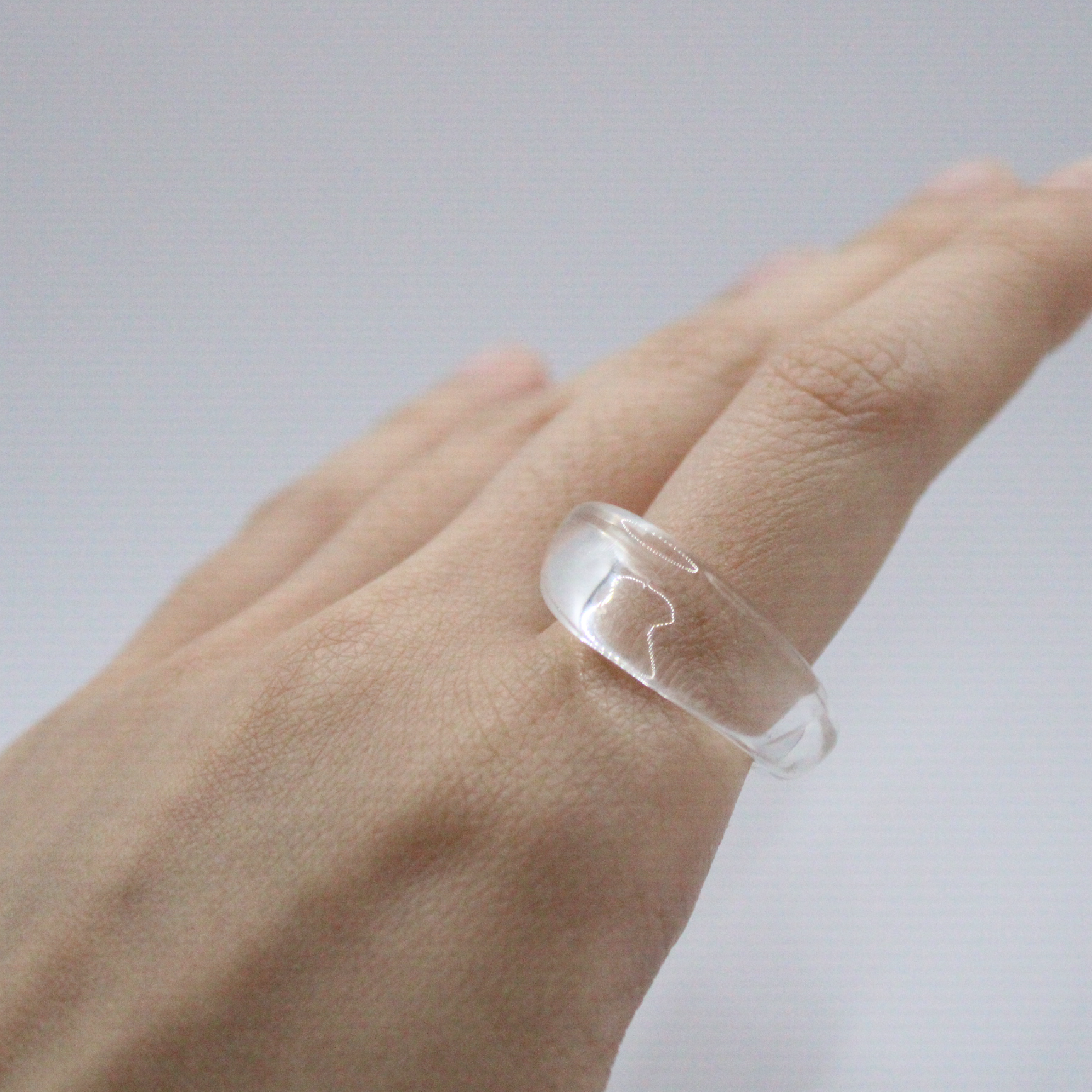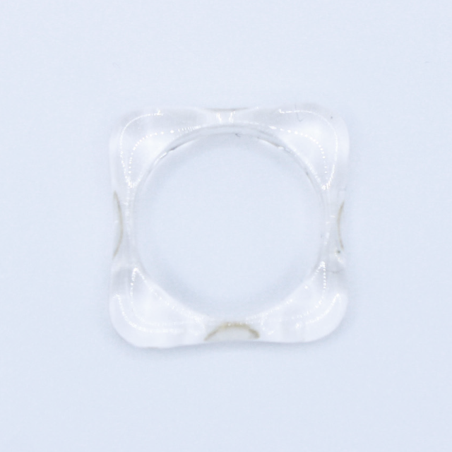 四角角形、鉱石のように加工したデザインのリング。 素材は、試験管・ビーカーと同じガラス素材のボロシリケイトガラスを使用しており、強くて軽いのが特徴。裏にゴールド(24金)もしくはプラチナを焼き付けています。