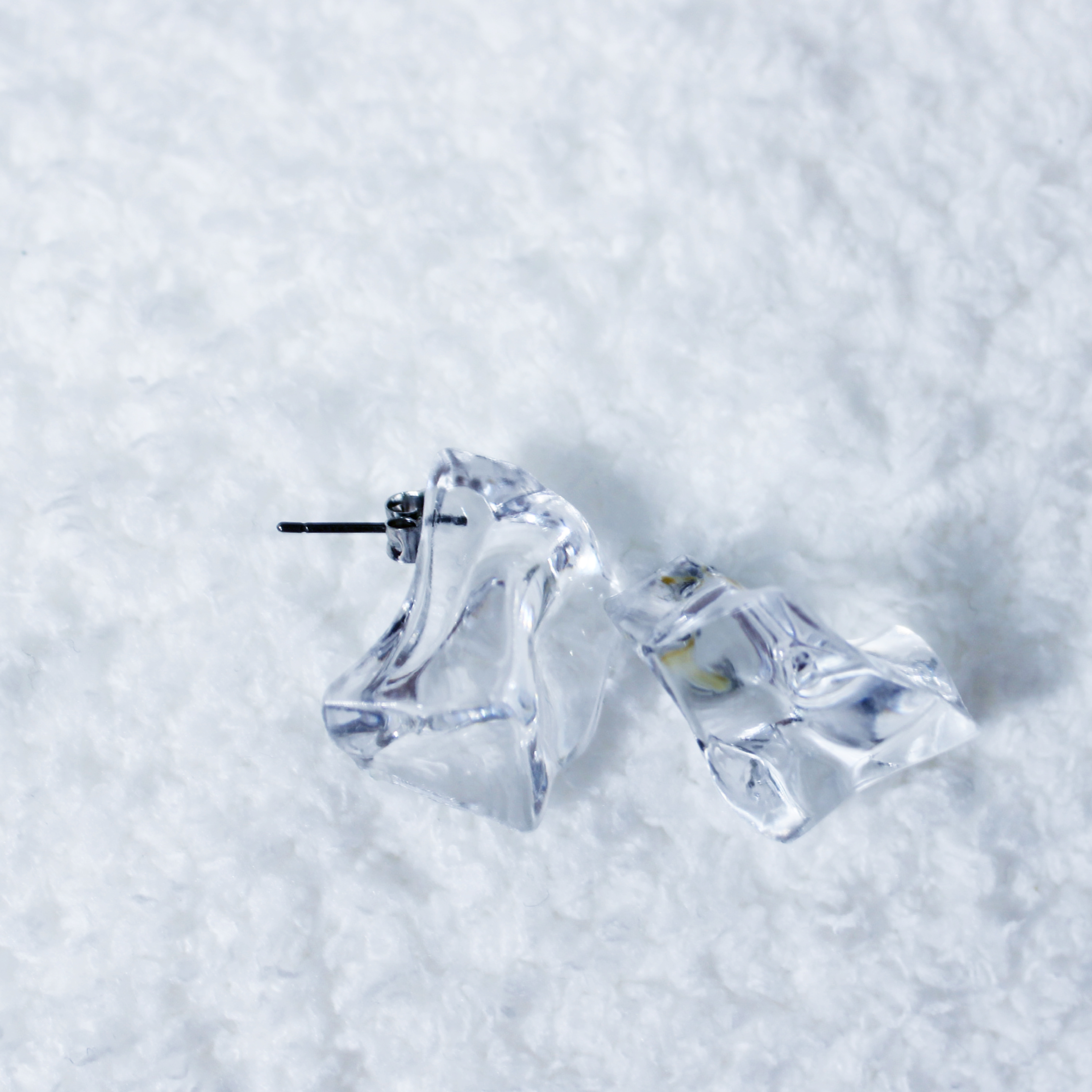 氷のようなニュアンスのあるクリアなモチーフでシーズンムードたっぷりに仕上げたピアス。大きさのあるデザインながら透明感でボリュームを感じさせないのがポイント。春夏スタイルのアクセント使いにぴったり。デイリーからパーティまで幅広いシーンで大活躍してくれそう。